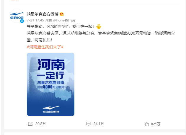 企业、明星纷纷展现应有的社会责任感,展开积极救援,捐款捐物,累积金额超过15亿。其中民族企业鸿星尔克捐赠5000万元,在由官微发布后,鸿星尔克的微博转载超过20万,评论超过24万,点赞更是高达821万,冲上微博热搜。鸿星尔克官微一夜涨粉40万。